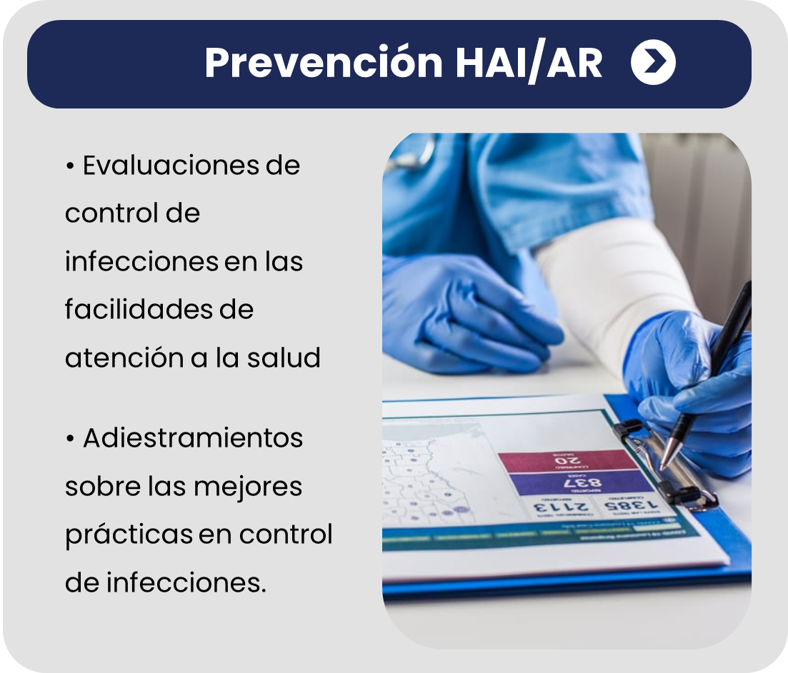 El Programa de Infecciones Asociadas al Cuidado de la Salud y Resistencia Antimicrobiana (HAI/AR, por sus siglas en inglés) del Departamento de Salud de Puerto Rico es uno (1) de los sesenta y cuatro (64) programas financiados por los Centros para el Control y la Prevención de Enfermedades (CDC, por sus siglas en inglés), establecido en el año 2019. Este programa tiene como objetivo fortalecer la detección, prevención y respuesta ante infecciones adquiridas en las facilidades de salud (HAI) y frente a la resistencia antimicrobiana (AR). Su propósito es apoyar a las instituciones de salud en la implementación de prácticas basadas en evidencia, optimizar el uso de antibióticos y promover la seguridad del paciente mediante educación, evaluaciones y colaboración interinstitucional.
