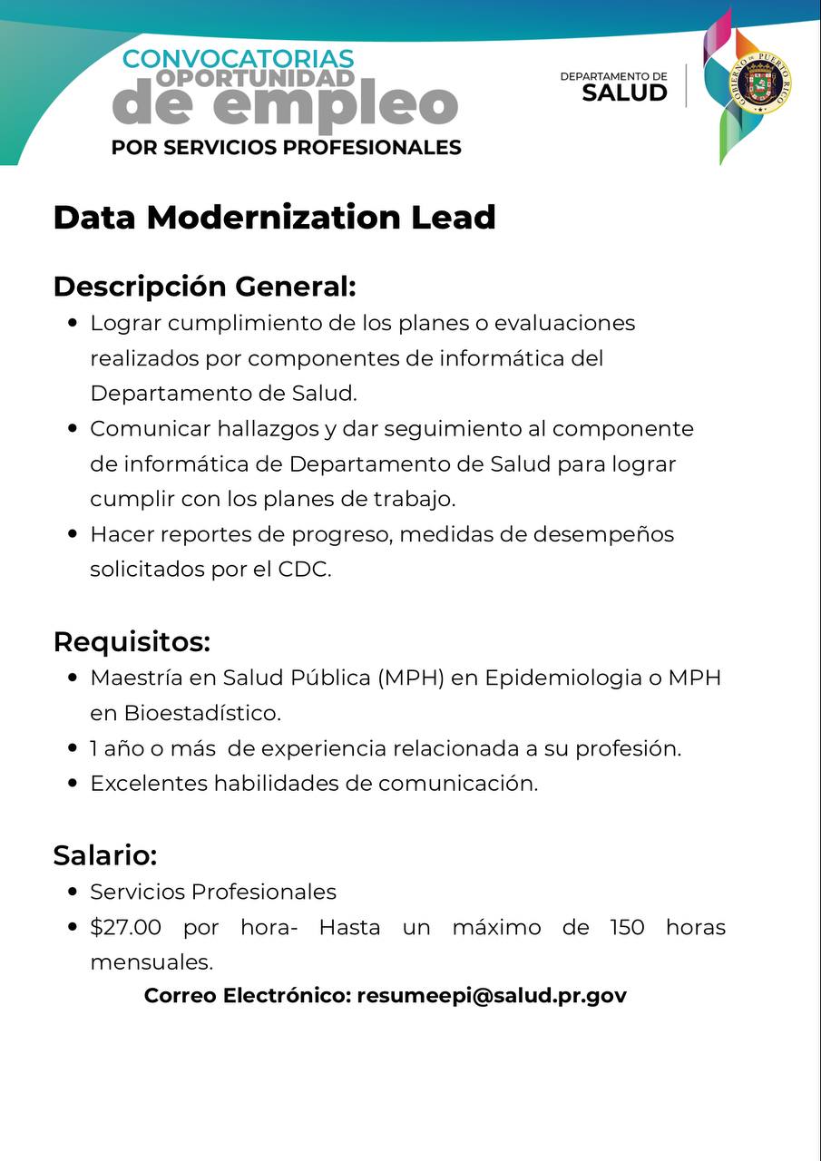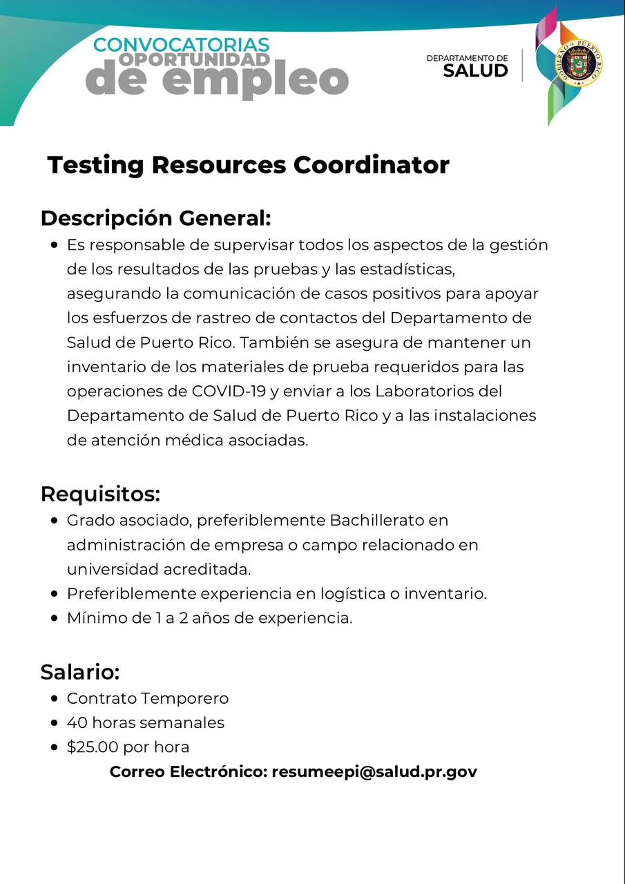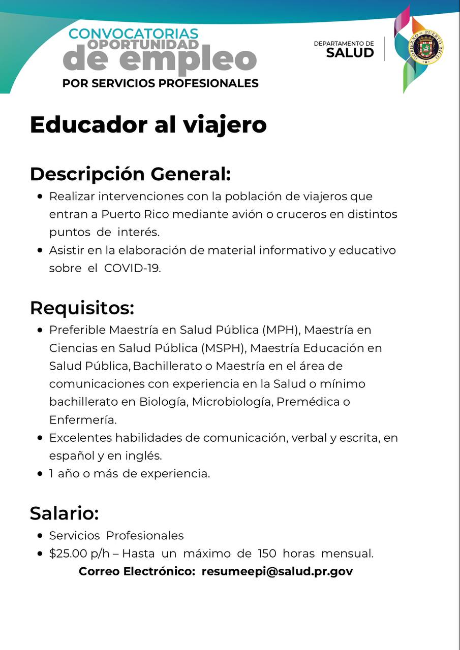 - Convocatoria: Administrador de Sistema de Información de Salud para la Oficina Central para Asuntos del SIDA y Enfermedades Transmisibles (OCASET) del Departamento de Salud: Fecha límite 15 de agosto de 2022.(CERRADA)