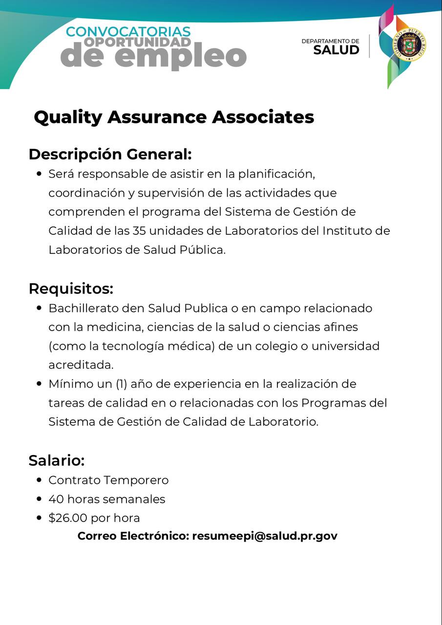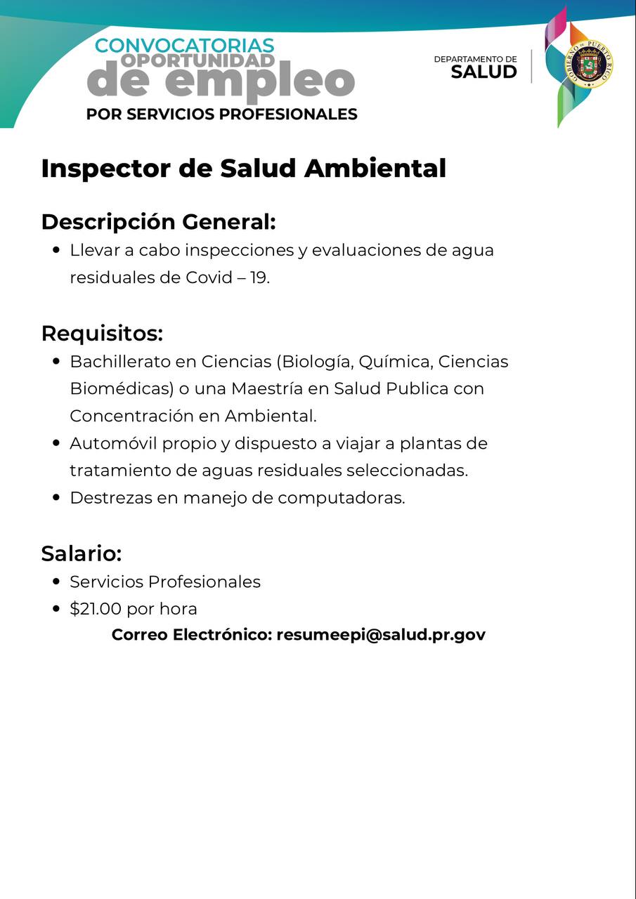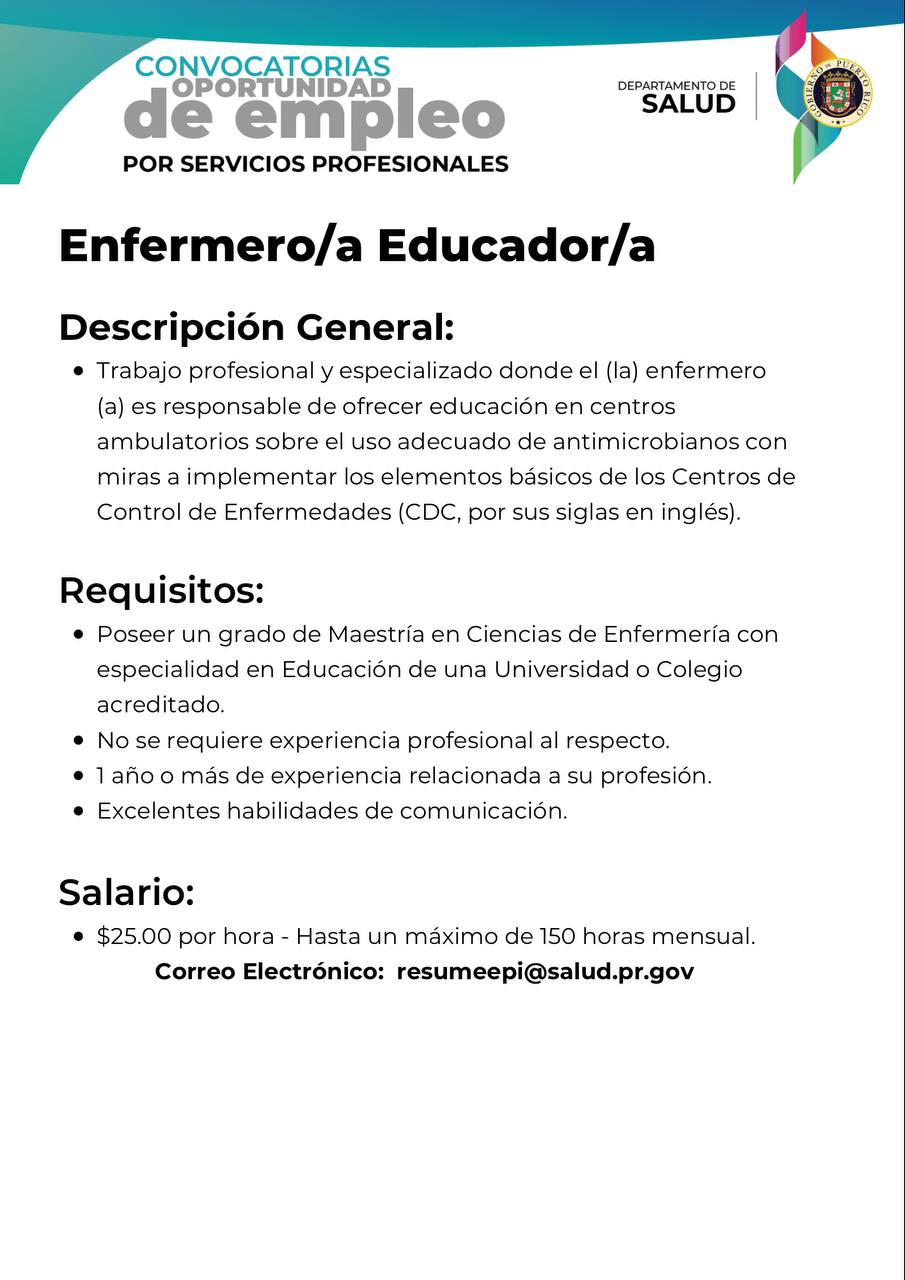 - Convocatoria: Administrador de Sistema de Información de Salud para la Oficina Central para Asuntos del SIDA y Enfermedades Transmisibles (OCASET) del Departamento de Salud: Fecha límite 15 de agosto de 2022.(CERRADA)