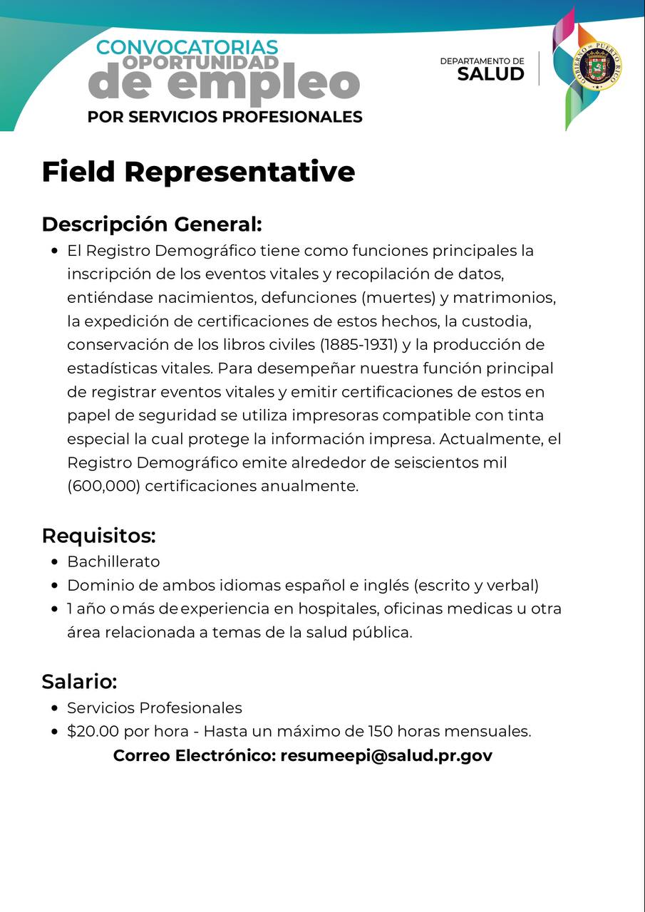 - Convocatoria: Oficinista de sistemas de información de salud para el municipio de Vieques