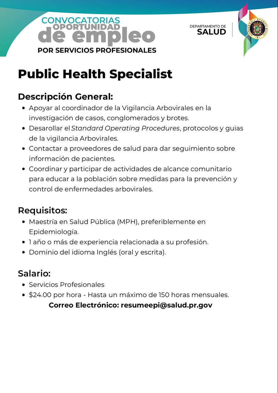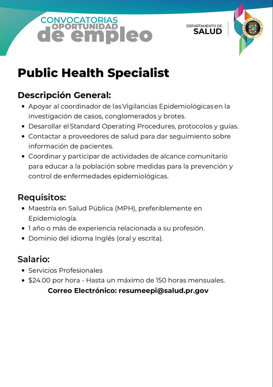 - Convocatoria: Técnico/a de Epidemiología (TE) para la Oficina Central para Asuntos del SIDA y Enfermedades Transmisibles (OCASET) del Departamento de Salud: Fecha límite 15 de agosto de 2022.(CERRADA)