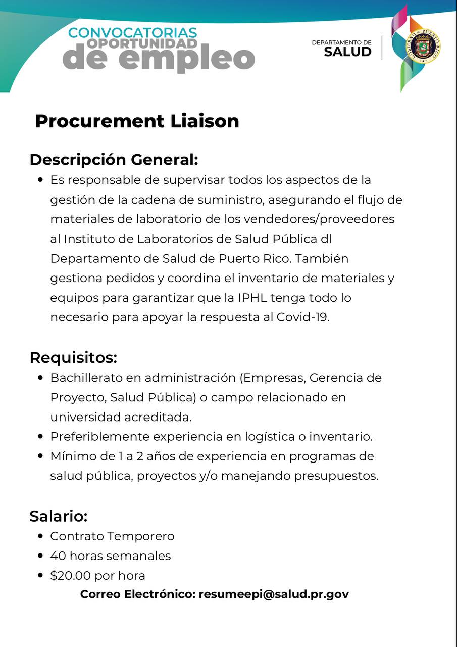 - Convocatoria: RECRUITMENT NOTICE - The Immunization Program requires the recruitment of temporary personnel for the following positions: IIS HELP DESK: Fecha límite jueves 30 de junio 2022(CERRADA)