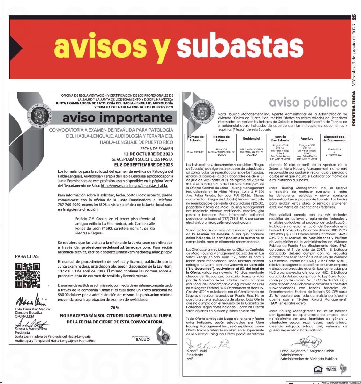 - Aviso Público: Convocatoria a Examen de Reválida para Farmacéutico (16 de septiembre 2024, 23 de septiembre 2024, Primera Hora y El Vocero)