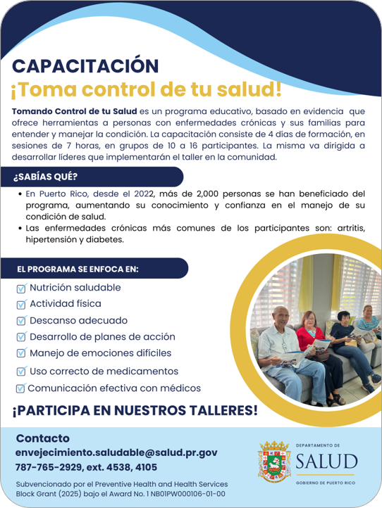 Tiene como objetivo capacitar líderes de distintas organizaciones en el Programa Tomando Control de su Salud, dirigido al auto manejo de enfermedades crónicas, para ofrecer herramientas a los participantes en el manejo de los síntomas asociados a las enfermedades crónicas.
