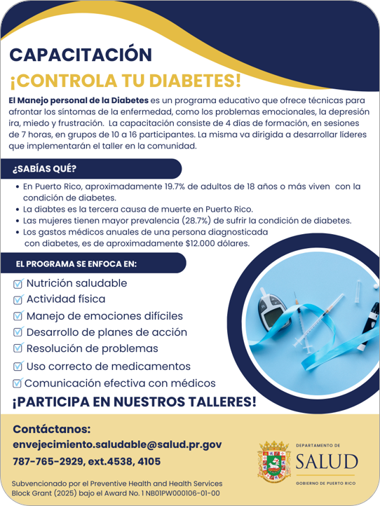 Tiene como objetivo capacitar líderes de distintas organizaciones en el Programa Manejo Personal de la Diabetes, dirigido al auto manejo de la diabetes.