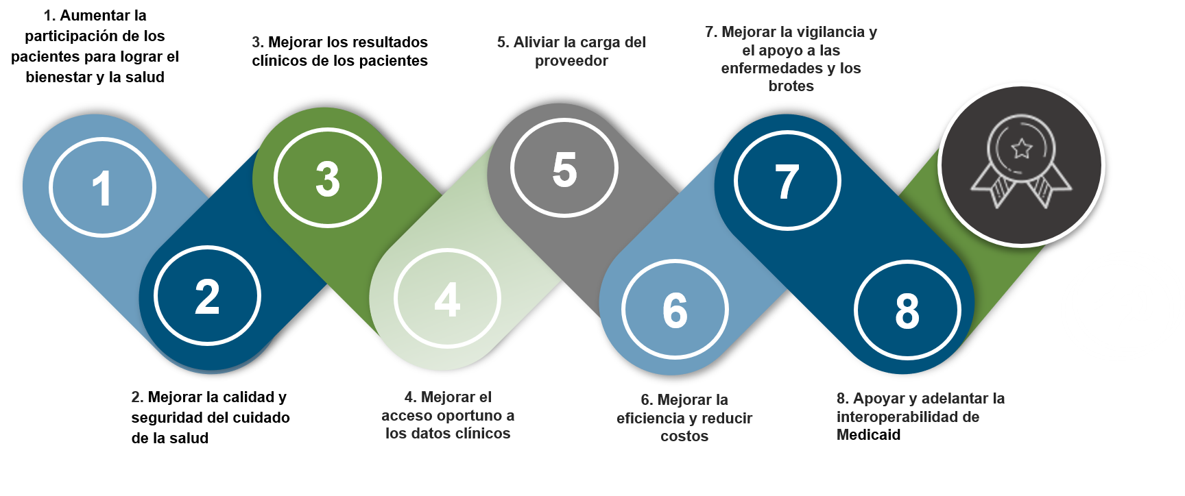 - Conexión con Medicaid Enterprise para promover el intercambio de datos, la calidad y la generación de informes.
