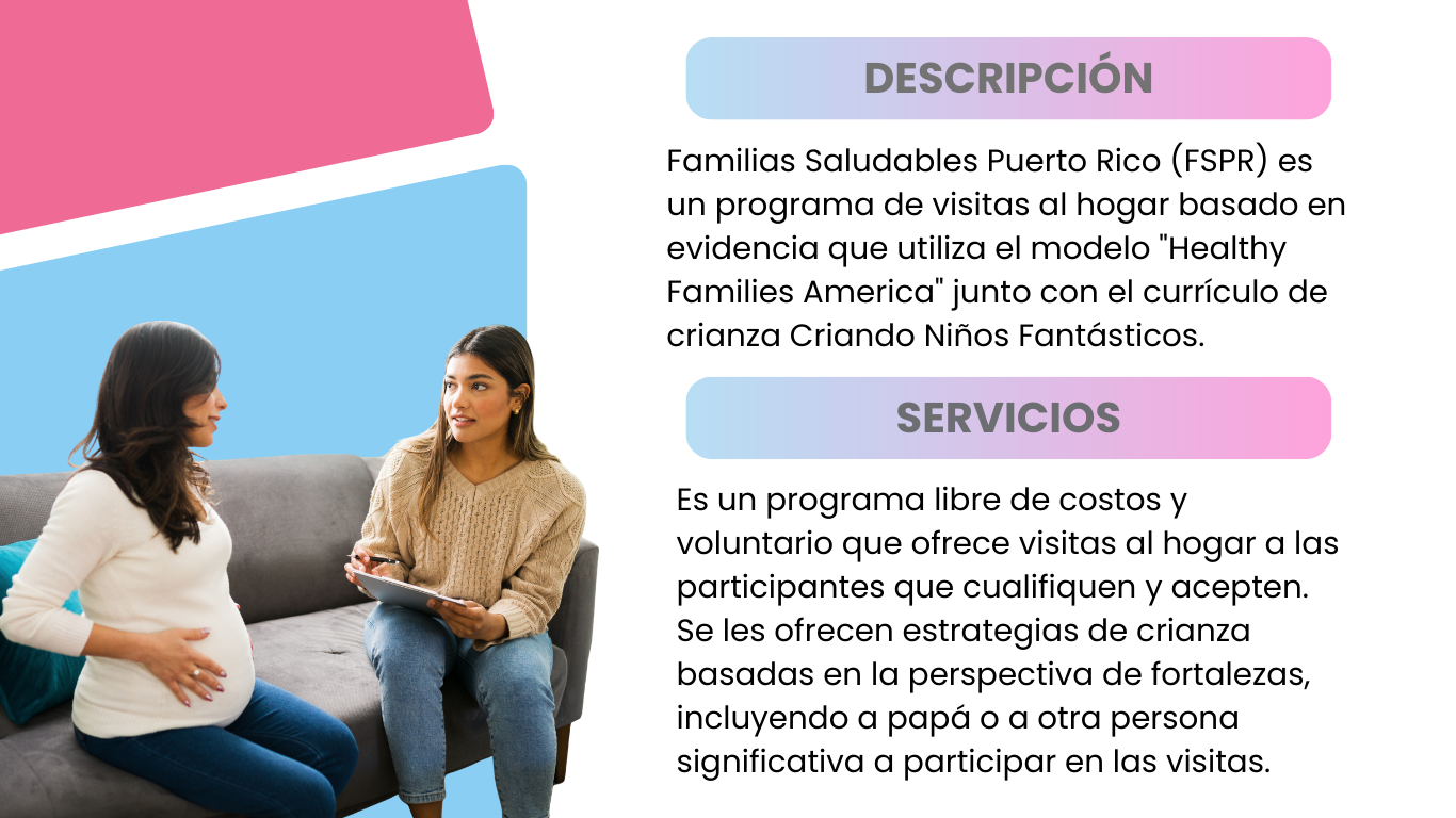 Familias Saludables Puerto Rico (FSPR) es un programa de visitas al hogar basado en evidencia que utiliza el modelo "Healthy Families America" junto con el currículo de crianza Criando Niños Fantásticos. Se le brinda servicios a participantes que estén embarazadas, dándole prioridad a adolescentes embarazadas, y que sean residentes de los municipios de Maunabo, Patillas, Arroyo, Barranquitas, Orocovis, Lares y Quebradillas.