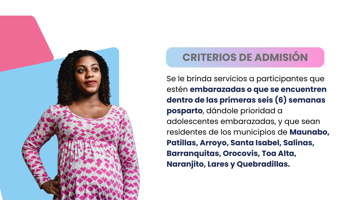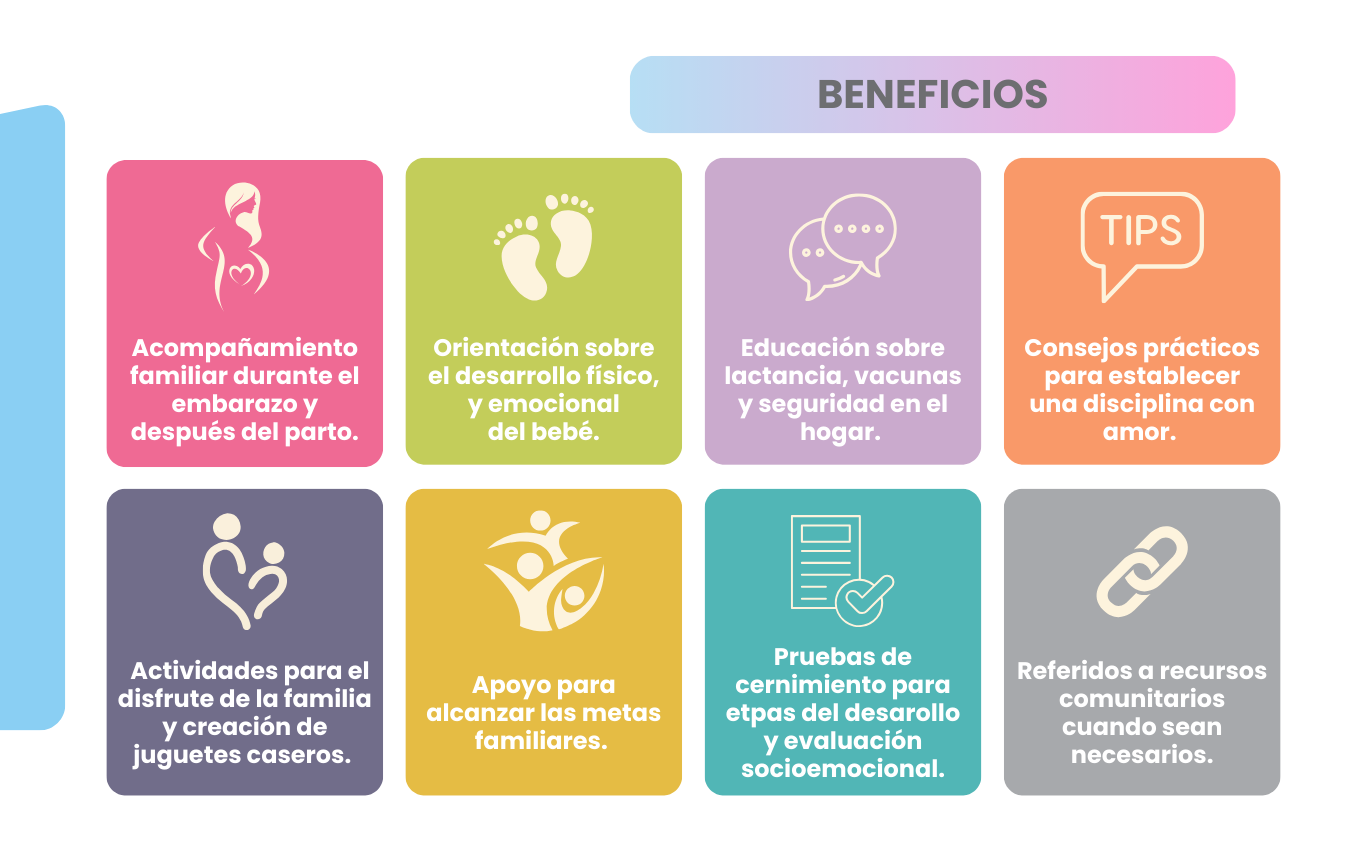 Es un programa libre de costos y voluntario que ofrece visitas semanales a las participantes que cualifiquen y acepten recibir las visitas al hogar. Se le ofrecen estrategias de crianza basadas en la perspectiva de fortalezas, incluyendo a papá o a otra persona significativa a participar en las visitas. Las familias participantes reciben cernimientos en diversas áreas incluyendo pruebas de depresión, desarrollo del bebé, violencia doméstica, uso de alcohol, entre otras. Además, reciben orientación sobre lactancia, métodos anticonceptivos, periodo interconcepcional, vacunación, desarrollo del bebé, seguridad en el hogar, entre otros. Conozca el Estudio de Necesidades aqui.
