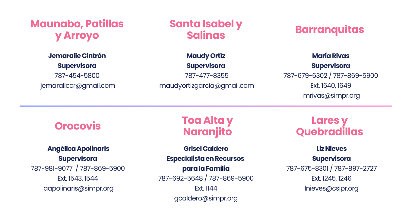 Para solicitar servicios o más información puede comunicarse con la Sección Madres, Niños y Adolescentes, Nivel Central, al 787-765-2929 ext. 4550; 4597 o con las agencias implementadoras.