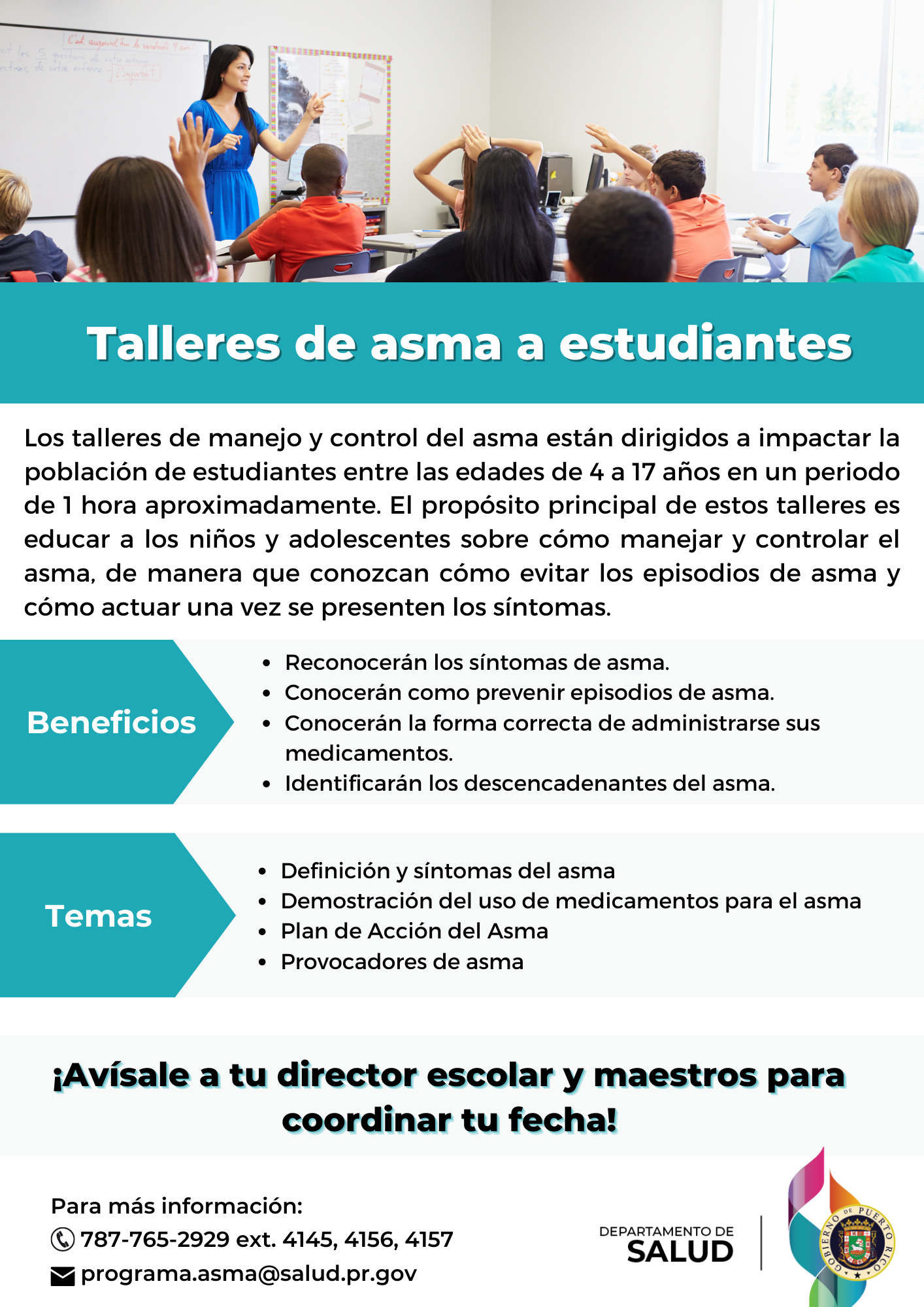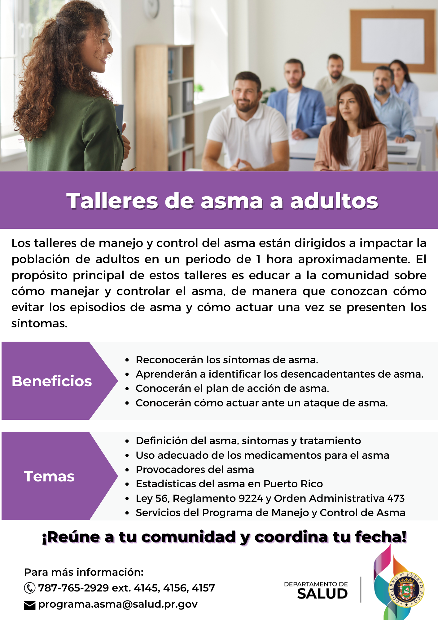 La Unidad de Manejo y Control del Asma forma parte de la División de Promoción de la Salud de la Secretaría Auxiliar de Salud Familiar, Servicios integrados y Promoción de la Salud. Este programa brinda diversos servicios educativos con el fin de mejorar la calidad de vida de las personas que viven con asma en Puerto Rico. Entre estos se encuentran los siguientes:
