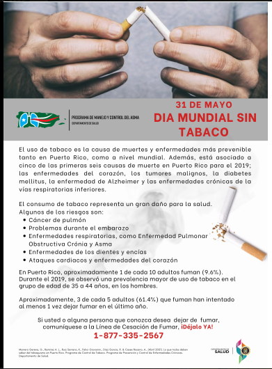 El Programa de Control de Tabaco tiene la responsabilidad primaria de prevenir la iniciación en el uso de productos derivados del tabaco, promover ambientes libres de humo, la cesación de fumar y el desarrollo de políticas públicas sobre el control de tabaco.